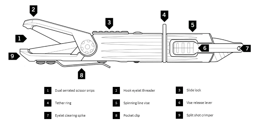 - Featuring: Spinning Line Vice, Tether Ring, Eyelet Clearing Spike, Hook Threader, Scissor Snips that can stay open to cut line while clipped, and a Split Shot Crimper.