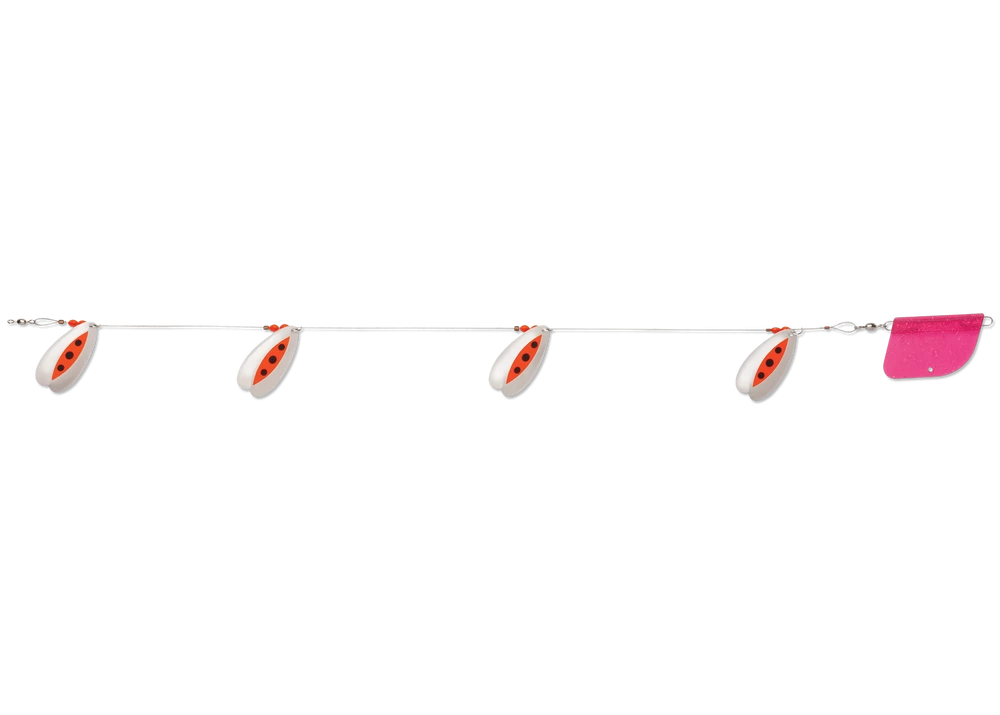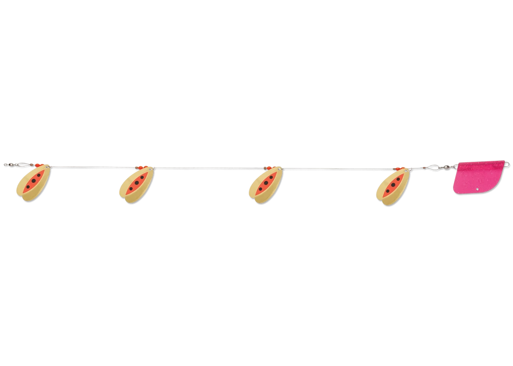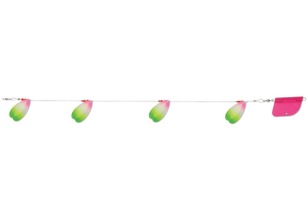The Luhr-Jensen Bolo Flex-i-Troll is a lake trolling rig featuring Luhr-Jensen’s unique Bolo blade design. With shape that essentially looks like two overlapping French blades, the Bolo design spins in wide circles, offering brilliant flash and vibration, even at slower trolling speeds. Multiple sizes allow the Bolo Troll to suit waters from smaller ponds to large reservoirs. A built-in trolling rudder eliminates spin and annoying line twisting.