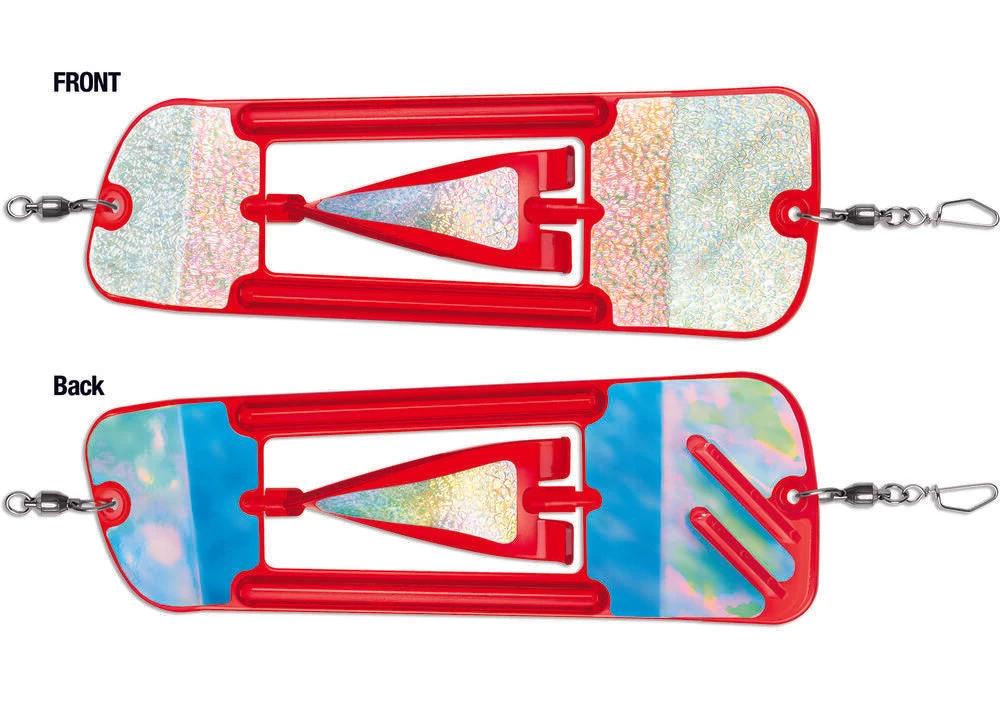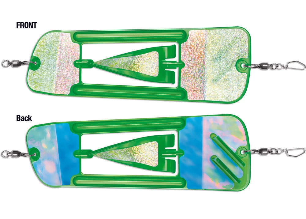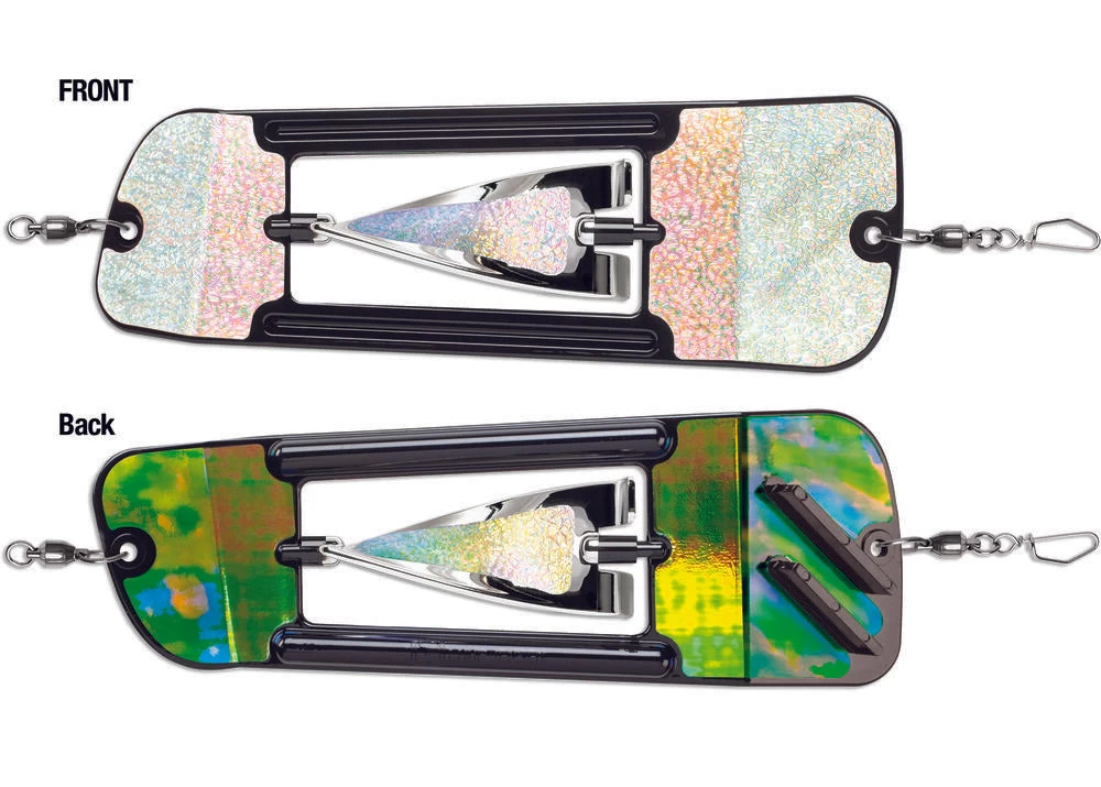 The Luhr-Jensen Coyote Cyclone Flasher is a new version of the Coyote Flasher with a rotating blade in the center. This easy pulling, fully rotating flasher rolls in a wide elliptical pattern, imparting fish attracting flash and motion to your trolling spread. The center “Cyclone” blade rotates independently adding a strobing flash and vibration. The Kick-Fin design keeps the flasher rolling over at virtually any trolling speed.