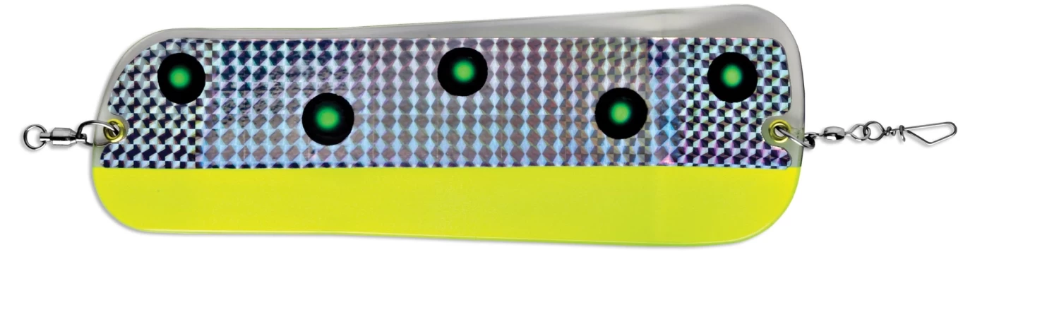 The Luhr-Jensen Coyote Flasher is the best deep water trolling device ever designed for attracting and catching big fish such as chinook salmon and lake trout. When pulled through the water, it develops a full 360 degree rotation. This churning motion creates sonic vibration and horizontal flash, which draws fish in from far away. Plus the unique erratic and pulsating action of the Coyote Flasher will hold the fish’s interest and prompt it to strike. Available in 2 sizes and 11 colors.